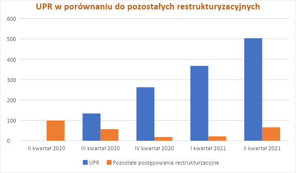 Z obwieszczeń opublikowanych od II kwartału 2020 r. do II kwartału 2021 r. w Monitorze Sądowym i Gospodarczym wynika, że otwarto łącznie 1530 postępowań restrukturyzacyjnych. Najczęściej wybieranym przez przedsiębiorców postępowaniem było uproszczone postępowania restukturyzacyjne, które stanowiło 83 % wszystkich postępowań restrukturyzacyjnych. Pozostałe postępowania stanowią niewielki odsetek: postępowanie sanacyjne – ok. 6 %, postępowanie układowe – ok. 2,5 %, przyśpieszone postępowanie układowe – ok. 8%.